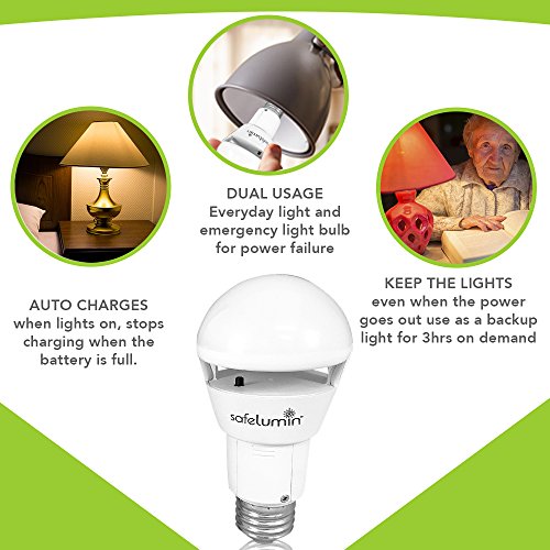 - KEEP THE LIGHTS ON EVEN WHEN THE POWER GOES OUT: No power no longer means no lights when using Safelumin emergency light bulb. No more struggling in the dark finding candles or flashlight. With the convenience of flipping your existing light switch, you will have our backup light for 3hrs on demand.
