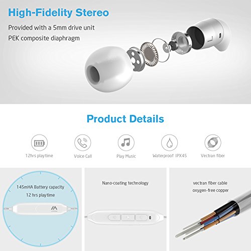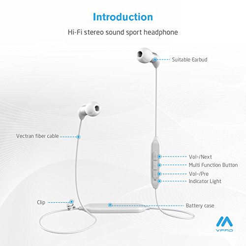 -. Feature : COMFORT & SECURE FIT DESIGN WITH SWEAT PROOF: With Ergonomic design and silicone earbuds to ensure your headphones stay comfortably firm in place while running, biking or at the gym. / HIGH FIDELITY STEREO SOUND: produce incredible sound quality with deep bass and crystal clear treble. / BLUETOOTH V4.2 WIRELESS TECHNOLOGY: Connect seamlessly with all Bluetooth enabled devices, up to 33Ft operating distance in open area. / LONGLASTING BETTERY LIFE:VFAD Bluetooth Headphones provides you up to 10 hours playing time, and 300 hours stand-by with one single charge. / PERFECT COMPATIBILITY: No matter if you use an iPhone, Android, or a PC, or choose to wear an Apple Watch, the headphones give full wireless music playback across multiple devices. Perfect if you¡¯re an Apple user and your partner loves Android.