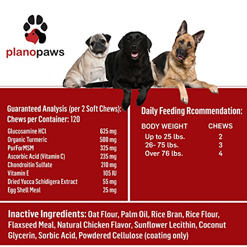 -. Feature : RELIEVES JOINT PAIN + IMPROVES MOBILITY OR YOUR MONEY BACK. ~ P.R.Ime Paws ActivFlex Superior advanced joint support for dogs provides the best ingredients to help your dog improve mobility, flexibility, and decrease pain. ActivFlex premium all natural ingredients focus on the joint health of your dog. ActivFlex tasty Chicken flavor soft chews make perfect glucosamine dog treats. / SAFE, EFFECTIVE, ALL NATURAL, GLUTEN FREE. NO CORN, NO WHEAT, NO SOY. ~ No sugars, salts, or gumming agents. ActivFlex No heat process maintains ingredient integrity while giving your dog flavorful nutritious glucosamine dog treats that your dog will love. ActivFlex 100% natural formula is perfect for young, middle aged, or senior small dogs, medium dogs, and large breed dogs. / 8 POWERFUL ACTIVE INGREDIENTS FOR PREMIUM JOINT HEALTH SUPPORT. ~ High quantities of 3 proven joint support ingredients. Glucosamine, Chondroitin, MSM for dogs. Glucosamine for dogs helps arthritis and hip dysplasia by reducing inflammation and repairing cartilage. Chondroitin is a key component of cartilage that helps keep joints cushioned during movement. MSM Is a potent antioxident, cell rejuvenator, and joint healer for your canine and may extend your dogs life. / 2 ANTIOXIDANTS KNOWN TO PREVENT INFLAMMATION. ~ Organic Turmeric for dogs is a safe anti inflammatory and powerful natural pain reliever. It helps support your pets heart health as well as detoxify the liver. It reduces the risk of blood clots and helps relieve allergies. Dried Yucca Schidigera reduces inflammation and helps with the treatment of arthritis symp. 2 Key Vitamins added for antioxidant protection and preventative care for your dogs joints - Vitamin C & E / DOGS LOVE THE TASTE. MADE IN THE USA. 100% LIFETIME SATISFACTION GUARANTEE. ~ ActivFlex Glucosamine dog treats taste better than a chewable and are manufactured in a GMP compliant and FDA inspected facility to ensure superior quality. We offer a NO QUESTIONS ASKED 100% MONEY BACK GUARANTEE. P.R.Ime Paws Mission is to develop safe premium all natural pet supplements with 100% customer satisfaction.