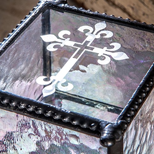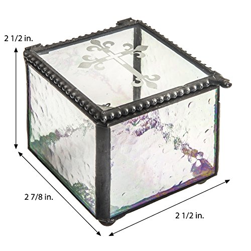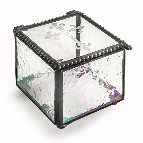 -. Feature : Tiffany styled keepsake box with clear iridescent glass that shimmers with rainbow colors / The etched cross on the top of this glass box makes it perfect for any Baptism, First Communion and Confirmation gifts / Decorative beaded edge and round ball feet add to the charm of this jewelry box / Handcrafted stained glass keepsake box made with lead free solder to protect you and the environment / Designed and Manufactured by J Devlin Glass Art 2 1/2" x 2 1/2" x 2"