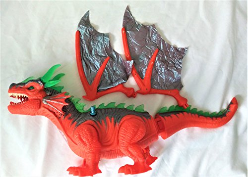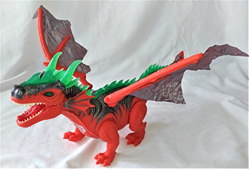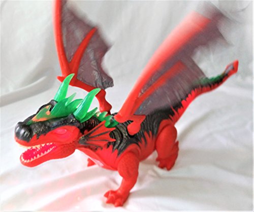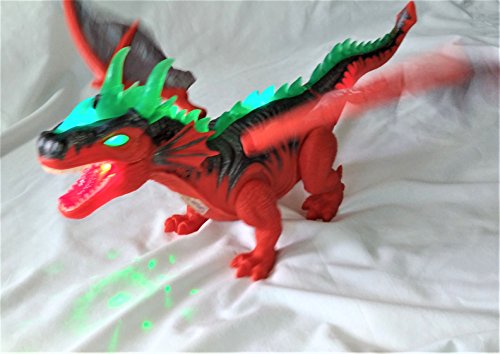 This toy gives kids all the sounds and action of a real Dragon. Run after your Red Fiery Dragon as he stomps the ground and walks around. Designed to emulate a real prehistoric animal to make it fun for all ages. The dragon makes noises and bright multi-colored lights add that extra spark you won't find in other toys! It requires 3 AA batteries (not included) and is made from non-toxic ABS plastic. Dragon comes in Red.Feature