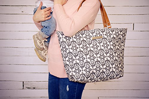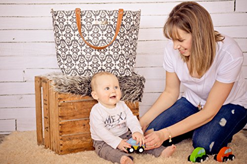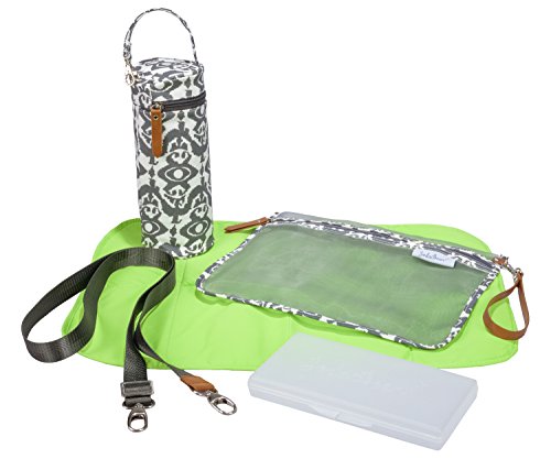 WHAT ESSENTIALS ARE INCLUDED WITH YOUR DESIGNER DIAPER BAG? 7 pocket organizer with zip closure, machine washable matching changing pad, secure closing wet wipes case, adjustable shoulder strap, insulated bottle holder, and multi-purpose mesh bag with wrist strap that fits 4 diapers, wipes dispenser, and changing mat. Convenient for that quick trip to the store, storing snacks, toys, or wet items - it's so handy!