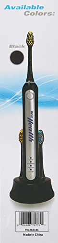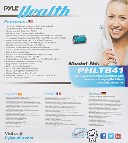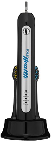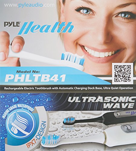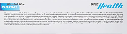 Plaque is the problem, Pyle health is the answer. Engineered to perform, the Pyle health ultrasonic wave rechargeable electric toothbrush is in a class of its own. The deep cleaning features and sleek design join forces to bring you superior cleaning for an unparalleled brushing experience. It's laboratory tested and guaranteed to reduce bleeding and gingivitis while improving your oral hygiene. The power of the handle coupled with the unique design allow the brushes to oscillate and pulsate, cleaning better versus a typical manual toothbrush. When fully charged, the built-in battery provides up to 6 full weeks of regular brushing. Enjoy 41,000 ultrasonic pulse vibrations per minute that improve gum health, removes food particles and destroys plaque below the gum line. It's also rechargeable and comes with a docking stand base that quickly charges the toothbrush. Choose your brushing intensity between (3) selectable modes: normal, whitening and massage. Additional features include a built-in timer with auto shut-off after two minutes of brushing and dentist-recommended auto-alert when brushing the same area for more than 30 seconds. Perfect for braces, bridges and implants, so you can brush freely without any discomfort or irritating pressure. Maintain a bright smile, fresh breath and healthy gums with the Pyle health ultrasonic wave rechargeable electric toothbrush.Feature