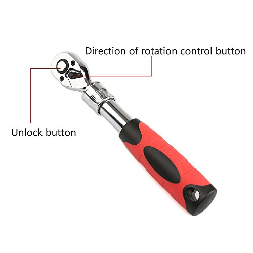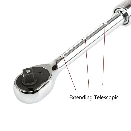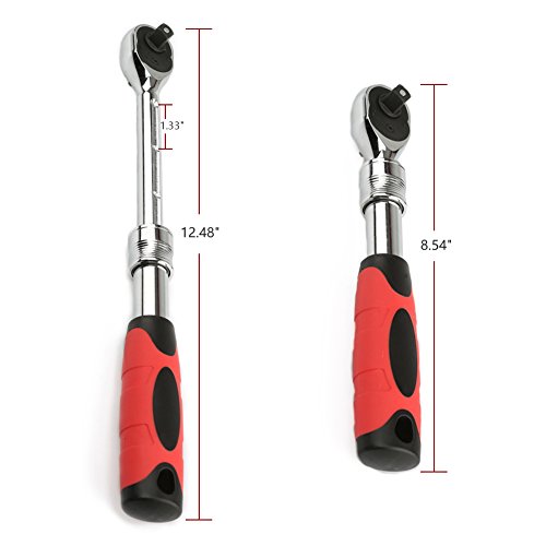 3/8-inch drive standard extendable ratchet, made with drop forged, heat treated chrome vanadium steel for increased durability; abrasion, oxidation, corrosion, and shock resistant.