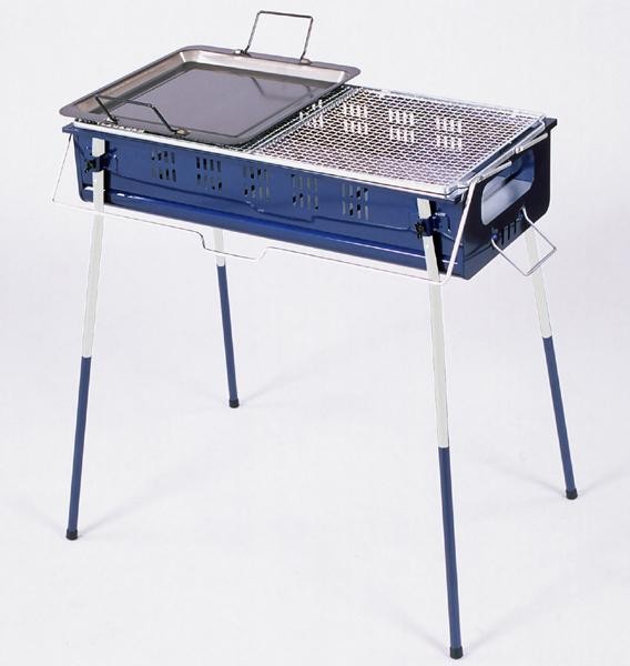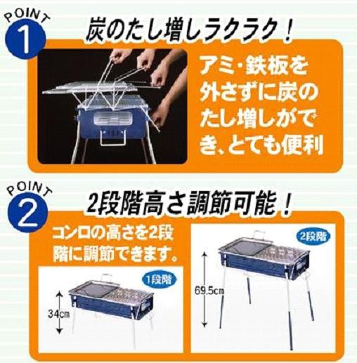 | 鉄板の塗装、アミのメッキは食品衛生法適合です。鉄板、アミを外さずに炭の足し増しがラクラクできる便利ものです。コンロの高さ調節2段(34cm/69.5cm)が可能で使用状況に対応できます。 |