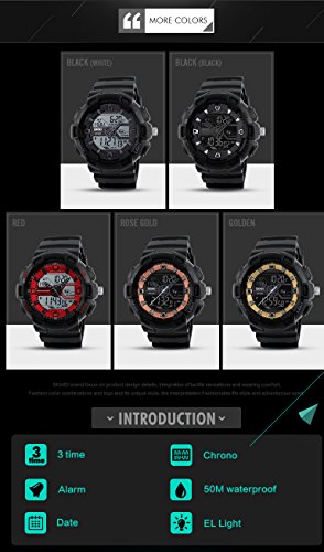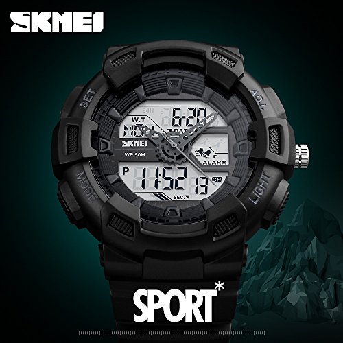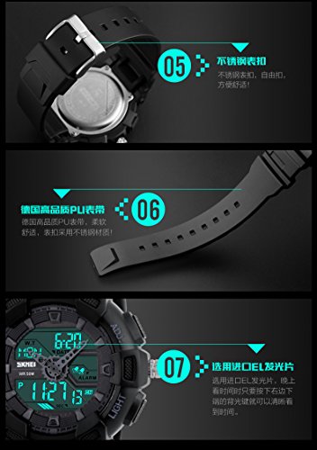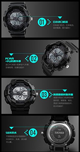 -. Feature : 164FT WATERPROOF: 164 ft waterproof (50 M) - 5ATM water resistant. NOTE: please DO NOT press any buttons in the water. / DUAL DIAL 3 TIMEZONE: analog and digital dual dial support two different timezone. Shock resistant, stop watch, military 12H/24H time, and LED back light functions make it perfect for all kind of sport and daily use. / COMFORT with FASHION: silicon rubber watch band with the large dual dial design make it comfortable to wear and lead you to edge sport fashion. Perfect for both indoor and outdoor activities. / MULTI-FUNCTIONAL: 3 Timezone, Calendar Day and Date, Week, Alarm, Water Resistant, LED Display, Back Light, Shock Resistant, Stop Watch. / WHAT IS IN THE PACKAGE: Fanmis Dual Dial Sport Watch x 1, Instruction Manual x 1
