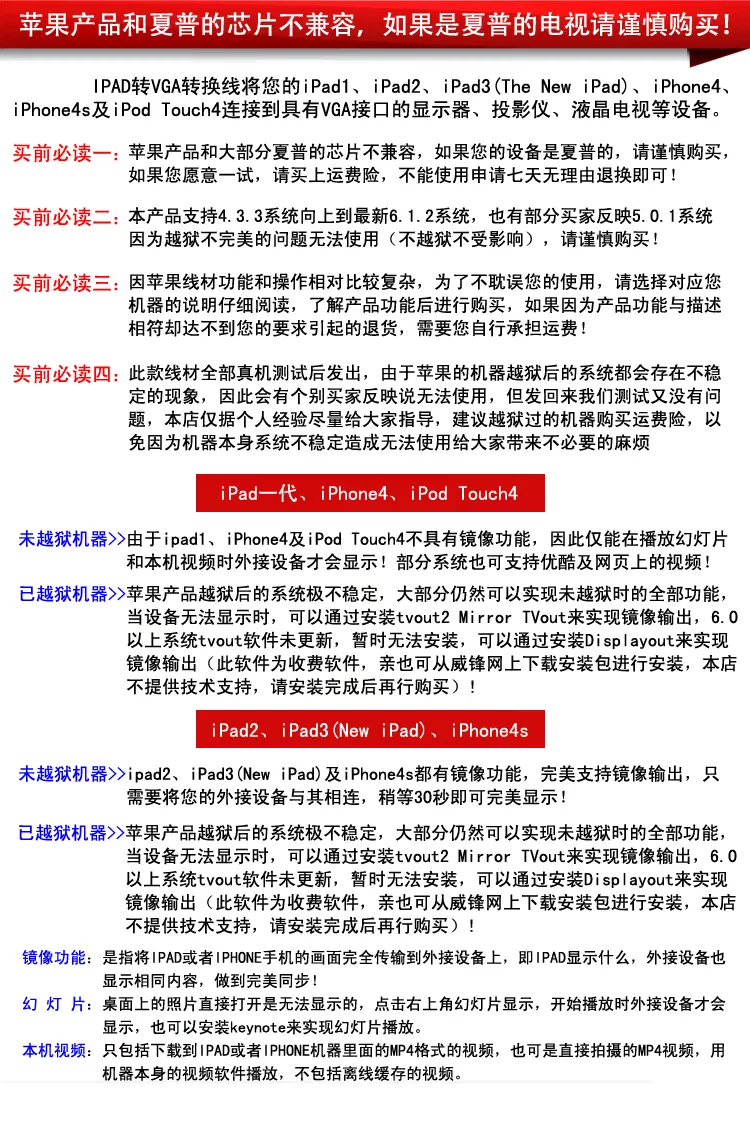 Because ipad2, ipad3, iphone4S 4:3 screen , it shows the desktop when there will be a relatively large black side , however: when playing a game or play support widescreen widescreen movie, the display automatically switches to widescreen when you connect under the joint improvement ipad desktop and sync to the TV screen gaming environment did not full-screen, and saw the black edges around two friends , not nervous, because ipad physical resolution is 1024 * 768 ( 4:3 ) ratio Next , in this case , connect the widescreen ( 16:9 aspect ratio / 10 ) of the synchronous mirroring copy output model is the ratio of the signal ipad copy Oh , this time designed for full-screen , then it is no longer mirror mode, and the screen of the ipad signal will make transverse tensile , icons and other display content will be deformed , but at the time photos and HD movies ( 16:9 ) mirror synchronization , because the source signal ratio and a TV match, so returning to full screen can appear !