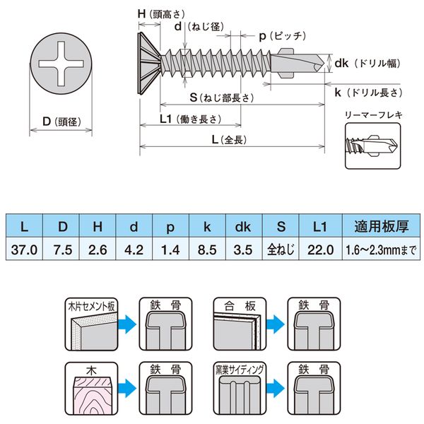 ●木片セメント板+鉄骨用ドリルビス 合板+鉄骨用ドリルビス 木+鉄骨用ドリルビス 窯業サイディング+鉄骨用ドリルビス