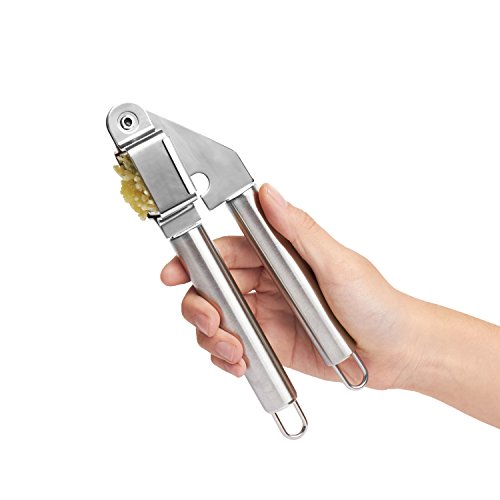 STURDY, HIGH-QUALITY MATERIAL → Our garlic press is made of high quality stainless steel with a chrome plated head. It is durable and will withstand the test of time even with vigorous use. Never have to buy another presser again - this press is built to last.