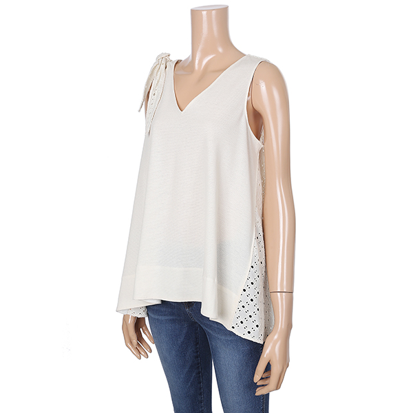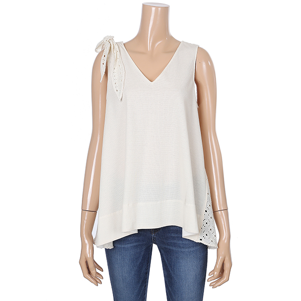 어깨에 리본 포인트가 있는 슬리브리스 블라우스입니다. A라인 디자인으로 밑단이 자연스럽게 러플처럼 떨어집니다.