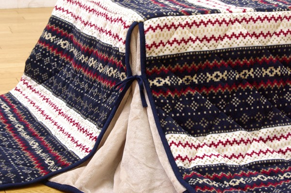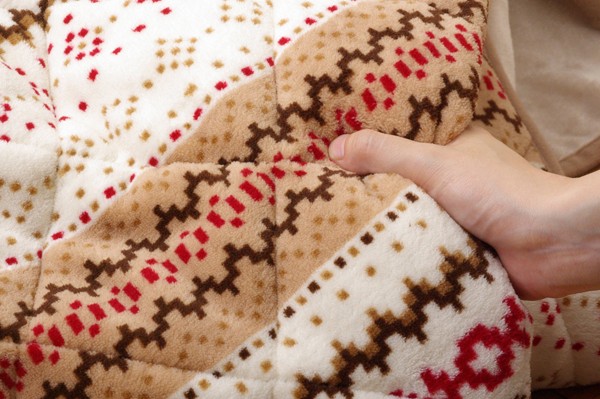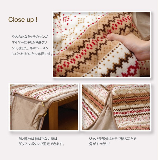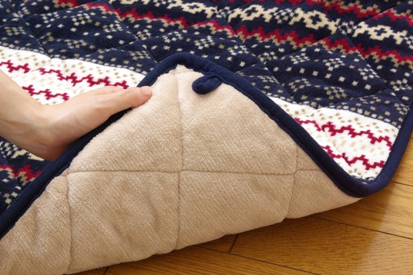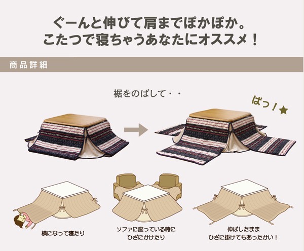 こたつで寝てしまうという方にピッタリのこたつ布団です。タレ部分を長く伸ばして使うこともできるので、横になってゆったりとくつろげます。表地には肌触りのよい、あったか素材の起毛生地を使用しています。裏地にはフランネルと呼ばれる、しっとりなめらかな肌触りのよい生地使用しています。省スペースタイプで四隅を結べば角が膨らまず、お部屋を広く使えます。薄手なので折りたたんでもかさばらず、コンパクトに収納できます。部分暖房のコタツは電気代もおトクです。