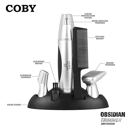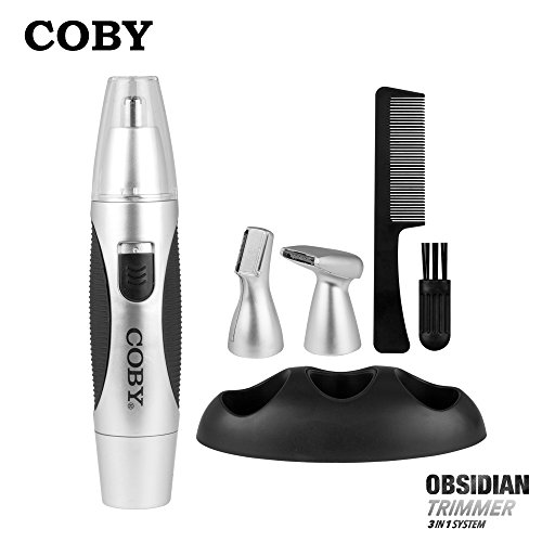 - ALL AROUND USE: Remove the unwanted hair on your ears, nose, beard, neckline, eyebrows and side-burns using this all-in-one trimming set from Coby. It features foil shaving head, hair comb, and ear and nose trimmer