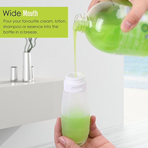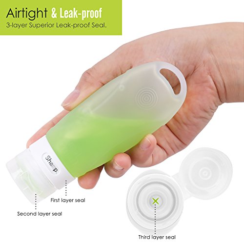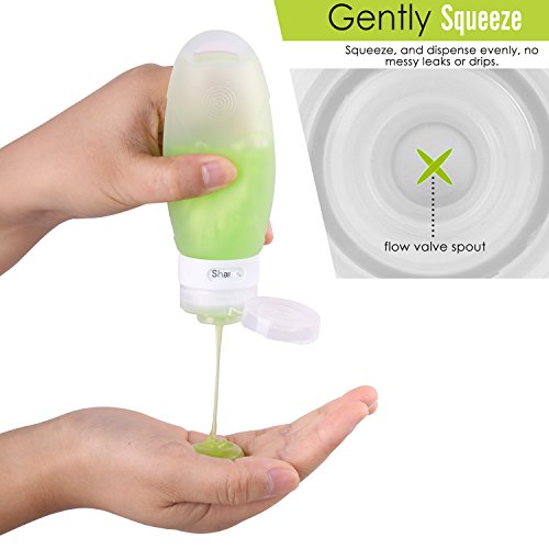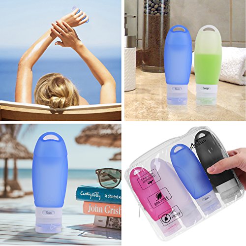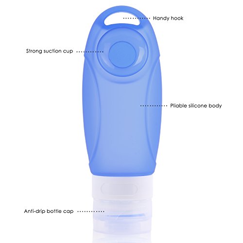 -. Feature : Made from medical grade silicone and PP plastic, BPA-free, perfect to carry shampoo, conditioner, gel, face cleanser and all liquide toiletries. Premium leak proof silicone and 3 layers tight seal protection design secure no drop, leaks and spills. / Sturdy, durable, covenient, and safe. FDA approved and Carry-on approved, the 3.1 oz(89ml) travel bottles set is the perfect size for carry on lage. / Soft and Pliable. Easy to squeeze and refill. Screw top and wide opening for easy filling, flip-top cap for easy dispensing. / Come with a suction cup and a handy hook on the main body of each bottle. You can stick the bottles to a mirror or wall, or hang to a hook from anywhere to squeeze out the shampoo / condition. / Multi-color and ID window for easily identify the contents of your bottle. Transparent PVC bag will allow you to pack other small toiletries safely.
