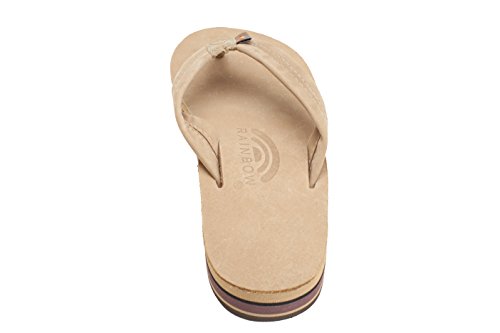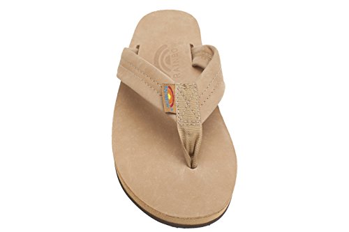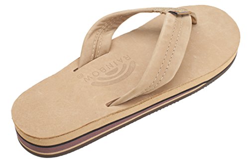 The double layer premier leather sandals offer all the great features found in our single layer leather, but with an added layer of midsole and pinline for more comfort and support. The top sole is made of nubuck leather and is embossed with the Rainbow logo. The strap, also nubuck leather is double stitched and comes together at a nylon toe piece secured with a parachute box X stitch pattern. All stitching is sewn with bonded nylon thread.Feature