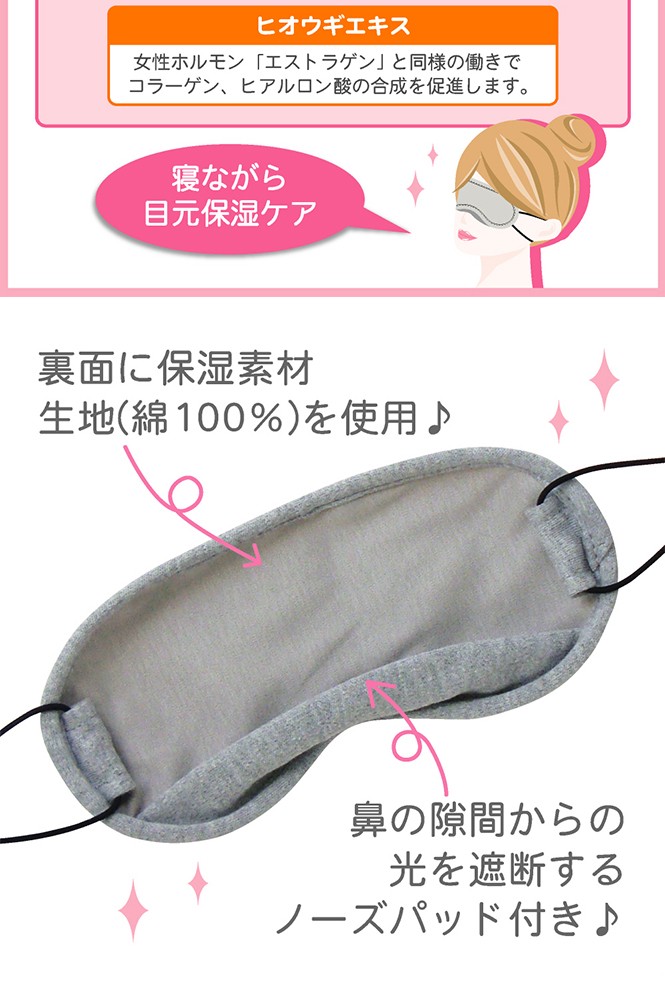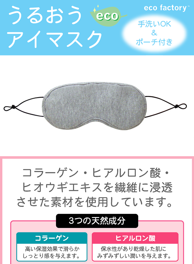| 商品説明 | コラーゲン・ヒアルロン酸・ヒオウギエキスを 繊維に浸透させた素材を使用したアイマスクです。 旅行時や睡眠時に…寝ながら目元の 保湿ケアができます。 繰り返し使用でき、手洗いで洗濯が可能です。 持ち運びに便利なポーチ付き♪ |