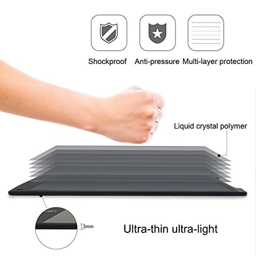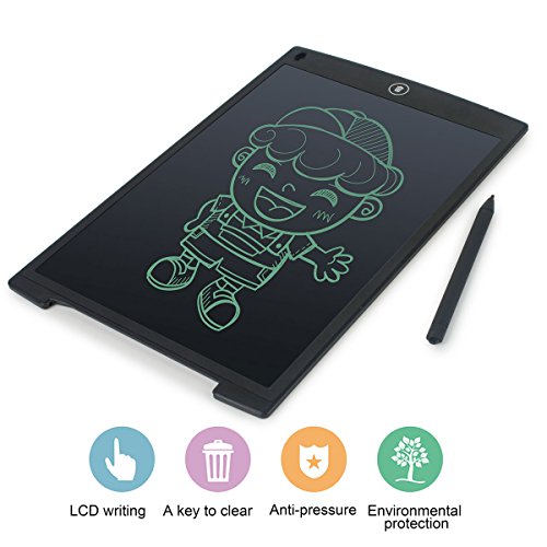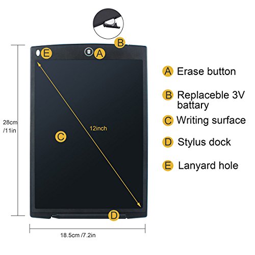 -. Feature : 【Easy to use】 The 12 inch pressure-sensitive LCD writing surface creates lines of different thickness based on how hard you push - just like paper and pen. Perfect for Memos,Practicing Handwriting,Shopping lists,To-do, Arithmetic,Drawing and Pictures.A good replacement of stickers and whiteboards. / 【Eco-friendly】 Writing or drawing with the included plastic stylus or any other suitable instrument - even your finger! You'll never need to search for a pen or pencil again. And you can save 1000 pcs paper every year!!! / 【Durable and ultra-lightweight】 This tablet is 0.19-inch thin and is easy to take in a purse,scheduler,briefcase or backpack. / 【Perfect gift】 Top educational tablet for kids and children.Ideal for home work,drawing projects or pictures,learning languages and much more.Makes a perfect gift for any kid,woman,man or senior citizen. / 【Lifetime Warranty】If you are not satisfied with our LCD Writing Tablet, let us know and you will be offered a full refund or replacement.