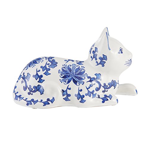Bombay Vine Ceramic Cat Figurine Décor Accent, 10-Inch, White/Blue