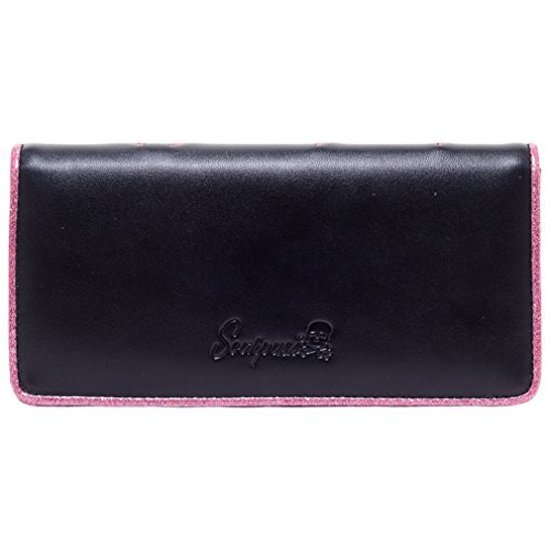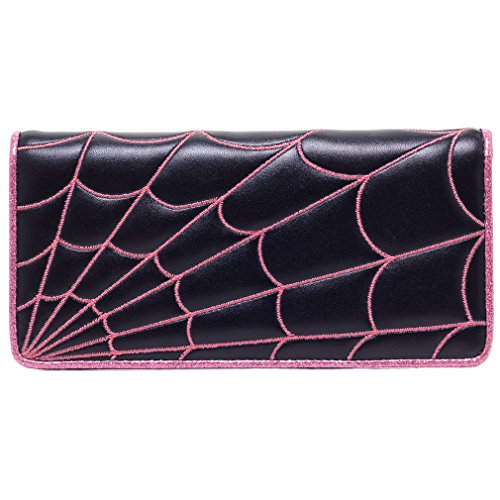 Product Description - Material: Vinyl - Dimensions: approx.18 x 2,5 x 9 cm - Spiderweb embroidery on front - Embossed Sourpuss logo on back - Glitter border and lining - Magnetic closure - 5 card slots - 2 bank note slots - One coin pocket with zipper