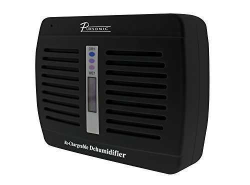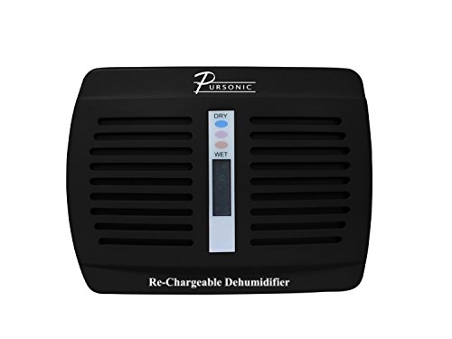 Pursonic compact rechargeable dehumidifier DHM100 - helps remove moisture from the air. The Pursonic DHM100 provides dampness protection that is ideal for small spaces such as: small closets in which the dehumidifier prevents damage to fabrics and musty odors caused by excess moisture. Other examples in which the DHM100 proves to be vital is under sinks, cabinets, plastic storage containers, and many more places. The DHM100 protects your valuable pictures and important documents from damage caused by excess moisture. Even at full capacity, the DHM100 will never Leak or spill a single drop of Liquid. It captures moisture vapor from the air and keeps it contained within the beads until the unit is ready to renew. This dehumidifier silently and reliably protects clothes and valuables form mold, mildew and moisture. The unit has indicators to show the moisture absorption, blue indicator to signify it is free form moisture, pink indicator to signify full of moisture. When the indicator turns pink, plug it back into power Outlet to recharge the unit. Special features of the Dam 100 includes : the unit works in areas up to 333 cubic feet. Requires no batteries or cords for use, 100% renewable, works up to ten years, reliable, compact, silent, spill and mess free, non-toxic, child and pet safe. Dehumidifier uses: bathroom/ laundry rooms: Dam 100 absorbs excess moisture from vapor related activities , and helps dry fabrics faster. Bedrooms: while absorbing excess moisture you are also reducing dust activity, and consequently the risk of allergies. Basements: protects stored clothing and tools from damage caused by excess moisture. Offices/supply closets: protects electronic equipment, supplies and paper from damage caused by excess moisture. Gym lockers: absorbs odors and dries wet gym clothes faster.Feature