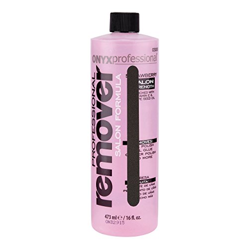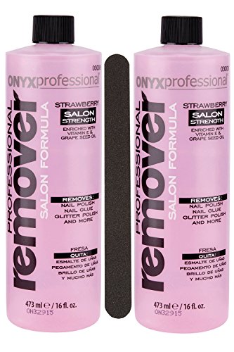 Onyx strawberry scented salon formula works great on removing nail polish, nail glue, glitter polish and more. Its unique salon strength formula is enriched with vitamin E and grape seed oil to condition nails. Includes two 16oz bottles and comes with nail file