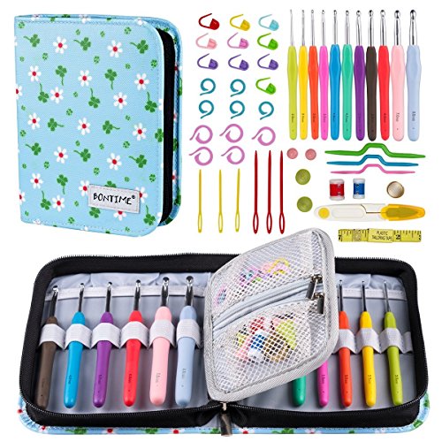 BONTIME Crochet Hooks Set - 11 Pieces Ergonomic Crochet Needles with Portable Case, Contains All the Knitting Accessories Fit Any Projects,Ideal for Crocheters with Arthritic,Clover Print