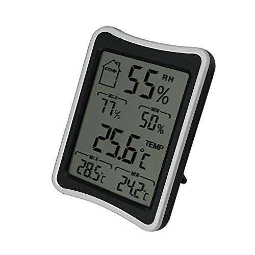 -. Feature : 現在の湿度と温度、最高室温・最高湿度、最低室温・最低湿度を測定する温湿度計です / 測定範囲:温度(-50 °C ~ 50 °C)、湿度(10% ~ 99% RH)、表示単位:温度(0.1℃)、湿度(1%RH)。サイズ:(約)高さ10.9×幅7.9×奥行き2.5cm / 現在の温湿度数値が表示されているだけでなく、過去記録された最高また最低温湿度測定値も画面に表示されています。裏側に「クリア」というボタンがあり、メモリを消去することは可能です / 大型液画面に大きな文字で表示されるので見やすいです / 置き用スタンドと壁がけ用フック穴付きで、どこでも便利に置きます
