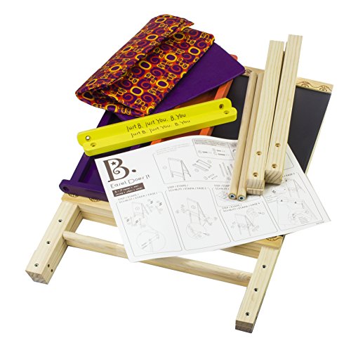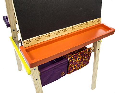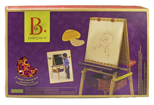 - Feature : CLASSIC QUALITY CONSTRUCTION: Made from natural, beautifully crafted wood, this easel is just what you would expect from B. designs: useful, playful, versatile. Features two different drawing surfaces for a larger and more active creative space. / DOUBLE SIDED CHALKBOARD / WHITEBOARD WITH PAPER CLIPS: On one there's side a chalkboard for classic sketches and on the other an easy-to-use, easy-to-clean whiteboard. Comes with top-mounted clips to hold paper masterpieces in place. / CLIPS, TRAYS, AND STORAGE BINS: Includes easel-length trays for crayons, markers, chalk, pens, erasers and more, as well as storage bins large enough for everything but the imagination. / EASY TO MOVE AND ASSEMBLE: Although it's solid and well built, your kids will be able to move it around their creative space very easily. It's also quick and easy for you to assemble. / FOR AGES 3 to 7: Just the right height for growing artists and durable enough for their masterworks, the B. Easel Does It is zany as well as professional.