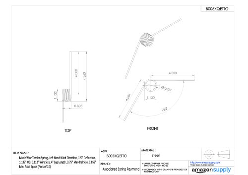 Music Wire Torsion Spring, Left Hand Wind Direction, 120° Deflection, 1.132" OD, 0.112" Wire Size, 4" Leg Length, 0.75" Mandrel Size, 0.859" Min. Axial Space (Pack of 10)