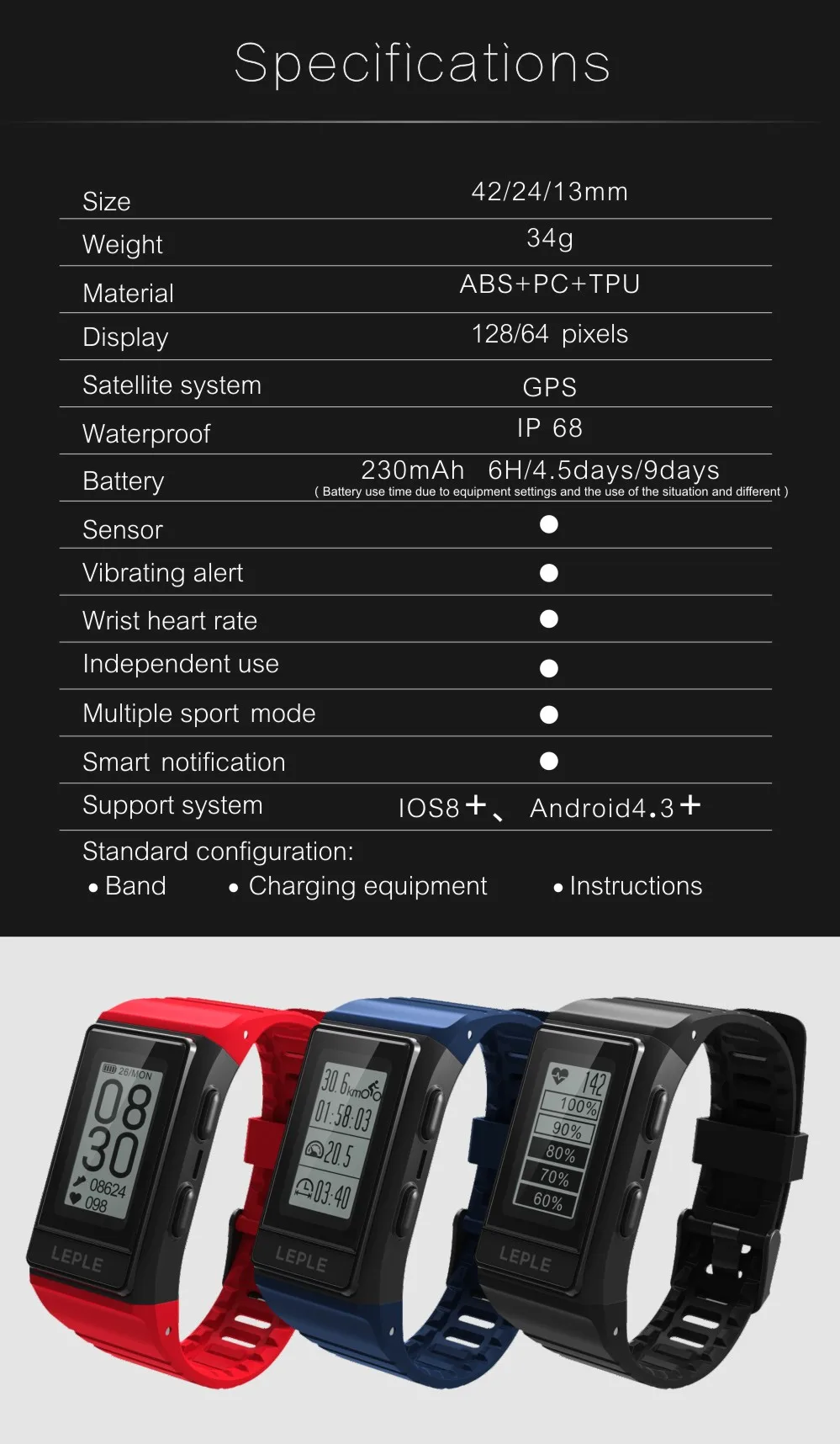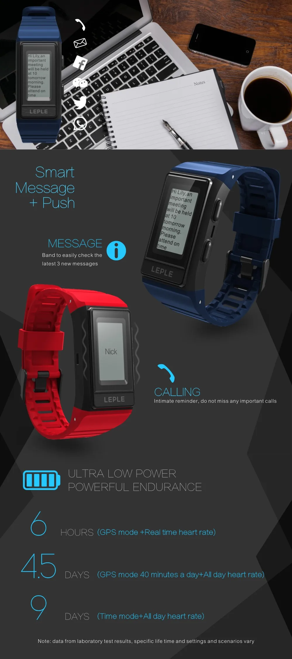 - Ultra low power consumption: 6 hours (continuous gps tracking), 4.5 days (40 minutes per day for gps tracking + All-day heart rate monitor), 9 days (time mode + All-day heart rate monitor).