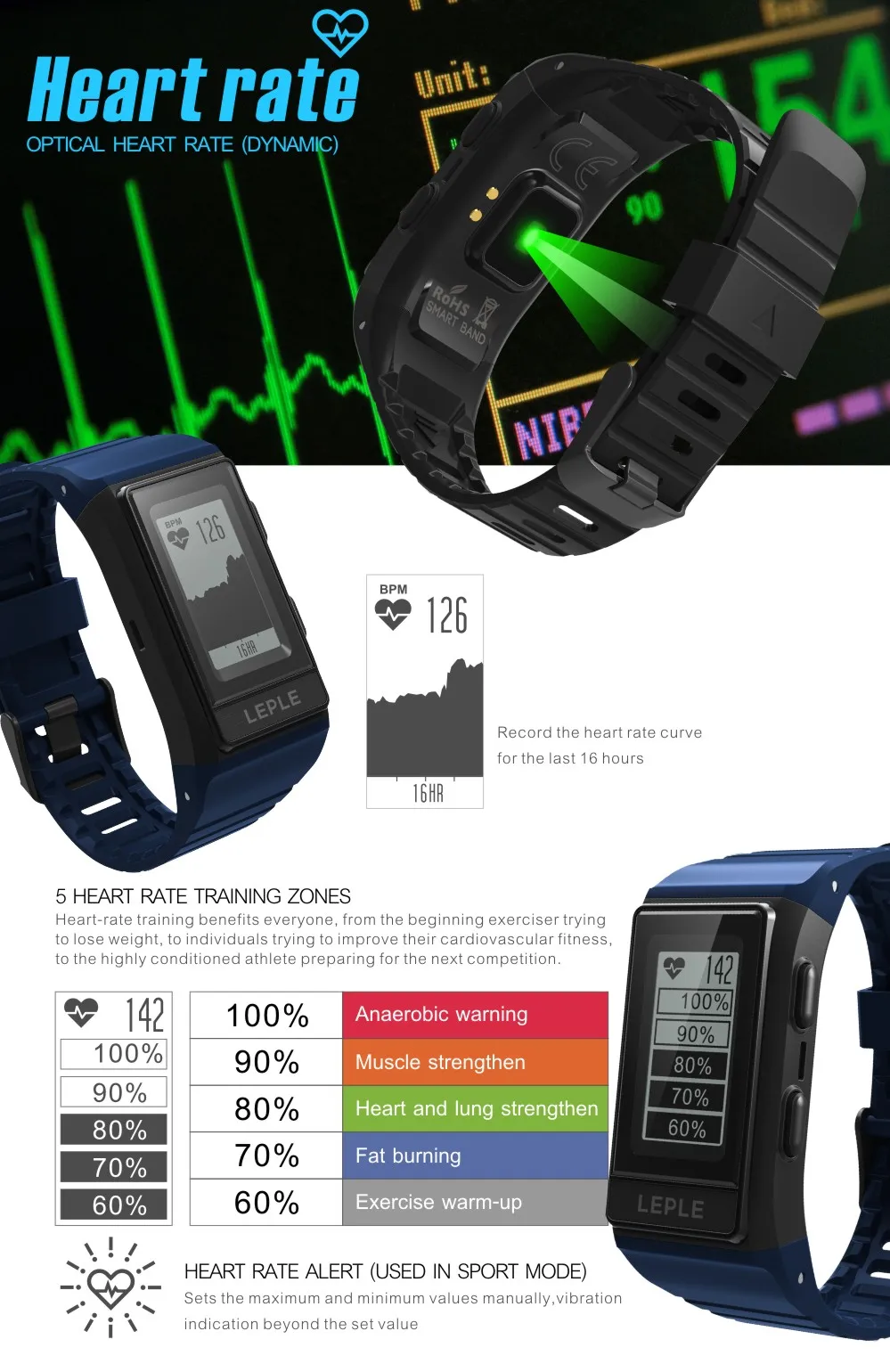 - Dynamic heart rate monitor, supports heart rate alert (in sport modes).