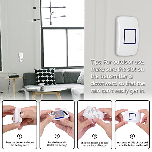 - Easy Installation: Easily plug receiver into an electrical outlet (no batteries required for main receiver). The push button can be fixed to the doorframe with the attached adhesive tapes. The push button is rated IP44 weatherproof and acceptable for outdoor use.
