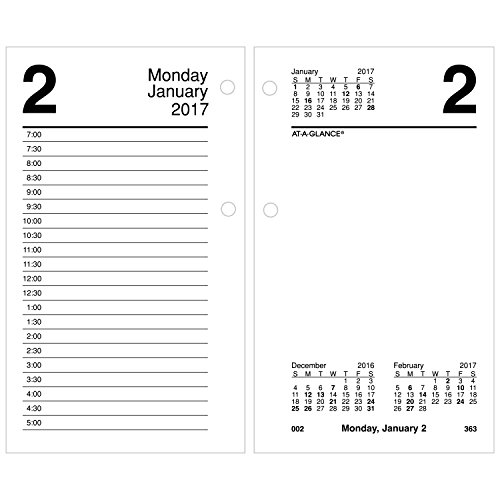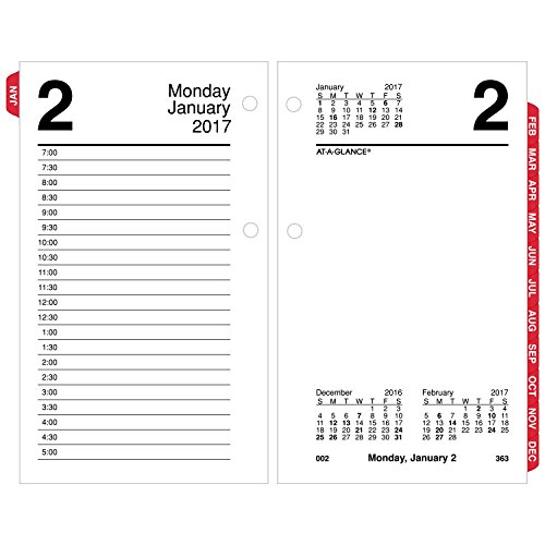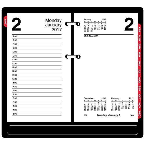 -. Feature : Daily refill will help you stay up-to-date and organized. Covers 12 months from January-December for year round planning. Julian dates / Features half hourly appointments, 7:00 a.m. - 5:00 p.m. and two pages per weekday with full weekends for detailed scheduling / 3.5 in. x 6 in. page size. 3.5 in. x 6 in. x 1 in. overall size / Past, current and future months reference for additional planning perspective / Fits standard 17 Style bases with 2 rings