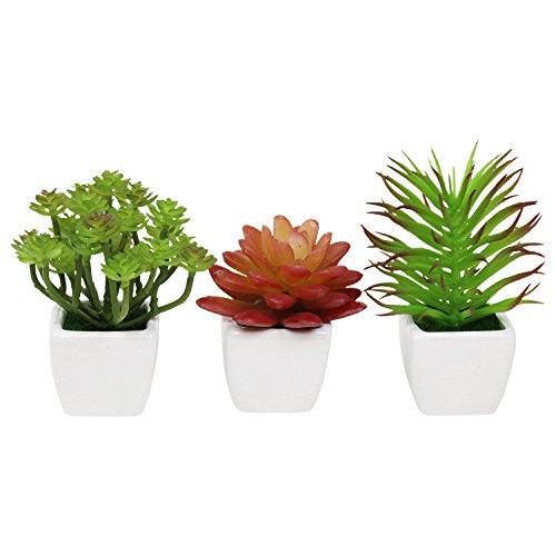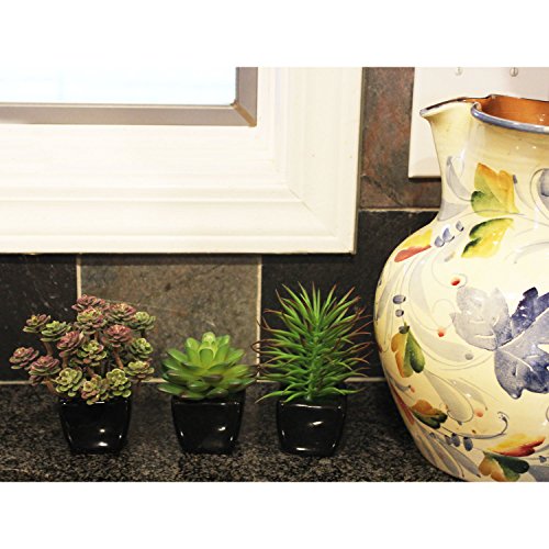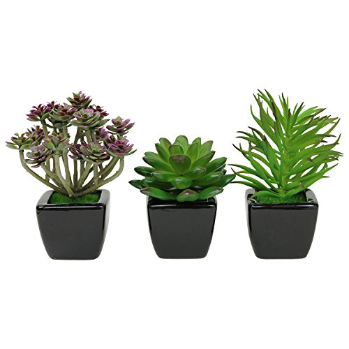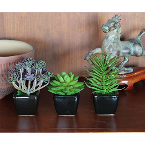 Avoid the hassle of maintaining your plants while enjoying all of the benefits with this set of 3 artificial succulent plants. Each plant comes with its own ceramic container in choice of black or white. These plastic plants offer highly realistic details that won't give your "gardening" away. Perfect for adding a touch of green to any space, without the maintenance of live plants. Bring outdoor color and charm to your indoor life with this set of 3 artificial plant pots. Approximate Dimensions (each plant, in inches): 4.5 H x 2 W x 2 WFeature