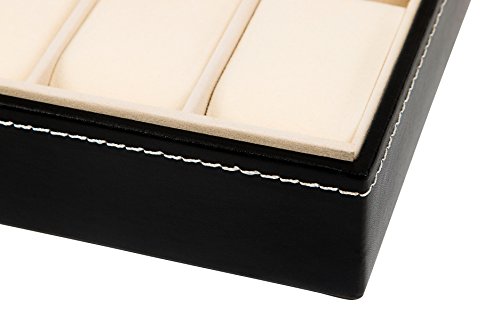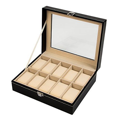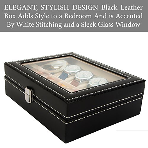 Elegant Watch Box 10 Mens Black Leather Display Glass Top Jewelry Case Organizer,