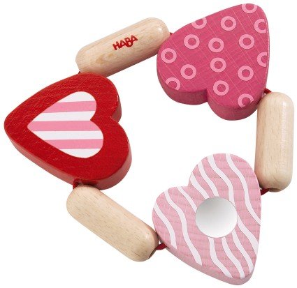 Fall in love with the HABA Mimi clutching toy. Its made up of three bright hearts of pink and red along with three natural colored wooden pegs in between. The hearts and pegs are all decorated in bright pinks and reds and each piece can spin freely.Feature