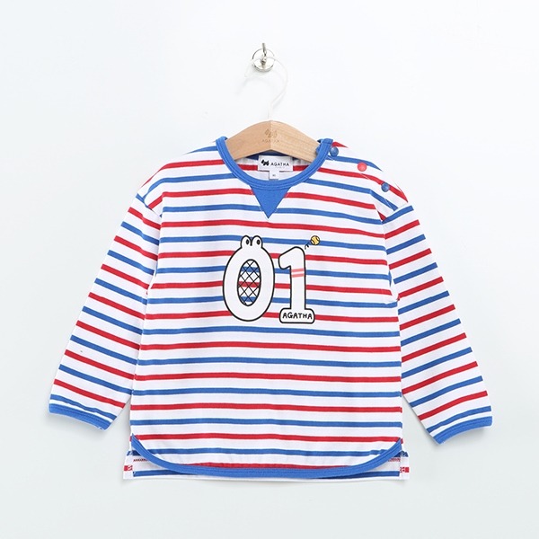 박시한 핏의 스트라이프 티셔츠로 스포티한 숫자 나염으로 포인트를 준 스타일입니다.