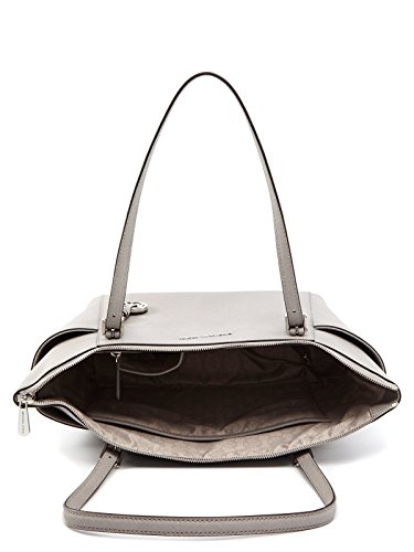 Pearl grey cross-hatch saffiano finished leather with polished silver tone hardware