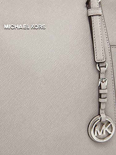 Before you jet off, be sure to bring along this fabulously sleek silhouette from Michael Kors. Sumptuous leather, luxe hardware and elegant contours make it the ultimate travel companion for any global or local getaway. It is wrapped in beautiful cross-hatch saffiano finished leather and is lined in silvery grey custom block monogram print fabric. There is an inner zippered pocket, two smaller slip pockets and an open slip pocket along the back wall. An inner key clip helps with the organization. It has a fully zippered top, and side gusset pockets. It is accented with Michael Kors logo on the front and his removable hanging circular logo charm. A flattened bottom panel offers (4) raised metal feet for additional protection. Dual leather adjustable buckle straps have a drop of about 9 inches. This gem measures approximately 12 inches along the bottom and tapers to almost 16 inches at the top. It is 11 inches high and 4.5 inches wide and includes a white Michael Kors dust cover.Feature