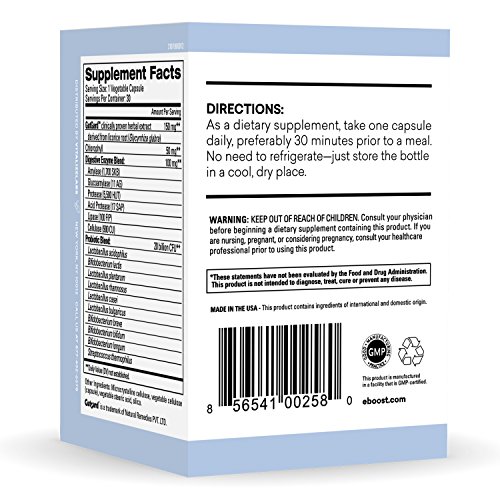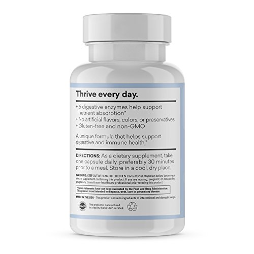 -. Feature : 20 Billion Live Cultures (Probiotic): Live probiotics from 10 different strains helps support digestive and immune health / 6 Digestive Enzymes: A proP.R.Ietary blend of 6 digestive enzymes to help digest macro food components (carbohydrates, proteins, and fats) and help support nutrient absorption / Chlorophyll: This green nutrient found in most plants is known for its antioxidant and cleansing properties. Each capsule of CULTURE provides the same amount of chlorophyll as 2 cups of spinach (50 mg of chlorophyll) / Gut Gard: A flavonoid-rich licorice extract that is clinically validated to help reduce bloating, nausea, and burping (150 mg of Gut Gard). / Non-GMO, soy free, gluten free, vegetarian capsule, no artificial colors, no artificial preservatives, shelf stable (no fridge required!)