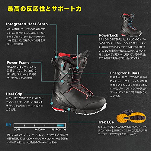 Studio : Salomon Snowboards Publisher : Salomon Snowboards Binding : Misc. Product Description From the craggy peaks of Wyoming's Tetons to the no-fall lines of Alaska's Chugach, the Salomon Men's Malamute Snowboard Boot is the go-to choice for aggressive riders charging the steepest terrain on the planet. As the stiffest boot in Salomon's line, the Malamute's earned a renowned status among freeriders bombing steeps at cheek-wobbling speeds and sending 30-foot cliffs into fluffy powder. Salomon's PowerLock Pro ensures a powerful, quick-lacing system with six lacing hooks cinching the upper as tight as humanly possible, with the laces securing in place with a criss-cross locker situated atop the tongue. Not only is this system both quick and convenient, but it retains a high degree of tightness that's extremely difficult to achieve with traditional laces. Revised for this season, the Power Frame shell is RPU-reinforced to retain its stiff flex throughout the course of multiple seasons. Another improvement, the outer shell is rubberized along the binding-to-boot contact zone, preventing premature wear resulting from the boot rubbing against the binding's heelcup. Another new feature, Energizer H-bars attach underneath the shell for a stiffer, more responsive feel. The Energizer H-bars are optional, so you can add them if you want additional stiffness or leave them off all-together. Inside the boot, the Platinum liner is comprised of Custom Fit Pro Foam, which is the most premium foam available from Salomon. This heat-moldable foam conforms to the unique contours of your feet, with it's multi-density structure retaining a high degree of stiffness without packing out like a softer boot. Also, the liner sports removable ankle bars, which really grab your ankle to prevent dreaded heel lift at higher speeds. 0