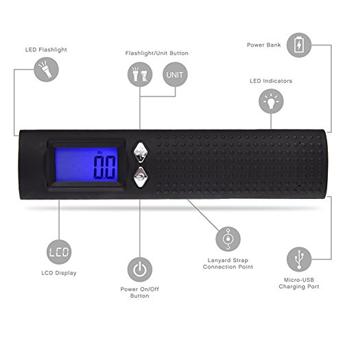 3 in 1 Compact and Portable traveler: Digital Scale with a BIG Backlight LCD Screen, Power Bank and built-in Flashlight. Ideal for travel includes a pouch to carry with you in simple way. Perfect companion for everyday use