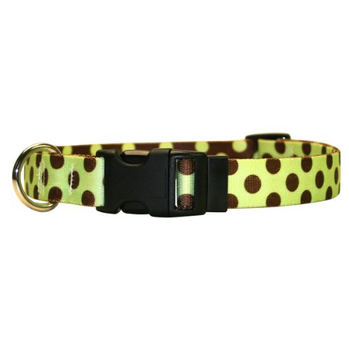 Studio : Yellow Dog Design Publisher : Yellow Dog Design Binding : Misc. Product Description This is the Green and Brown Polka Dot Dog Collar with Tag-A-Long ID Tag System - Size Large - 1 inch wide and fits neck sizes 18 to 28 inches from Yellow Dog Design, made right here in the USA. Keep your dog in the latest fashion with this stylish, functional and durable dog collar. TAG-A-LONG - This brand new, patent pending Pet ID Tag system is built right in to this dog collar. The Tag-A-Long system makes it easy to swap out ID tags from one collar to another, or to change ID Tags on the same collar. Perfect for when a special tag is needed at the dog park, on the beach, or as a service dog. We've included this special feature at no cost! EASY ON EASY OFF - Using a quick release clasp, the collar can easily be taken on or off the dog. Don't worry though, opposable thumbs are necessary to activate the quick release. SIZING: This dog collar utilizes a quick clasp closure, also called a side release clasp. Sizing is given as a range of neck lengths. Measure your dogs neck size or its current collar length (not including buckles) to obtain correct sizing. If you are shopping for designer, affordable dog/pet collars, then look no further. These durable, guaranteed to last dog collars have no rough edges, no threads to fray or break, no problem going in the wash, and no stress getting them on or off your dogs. 0