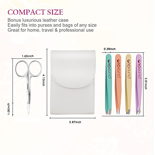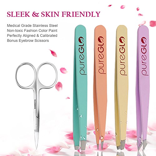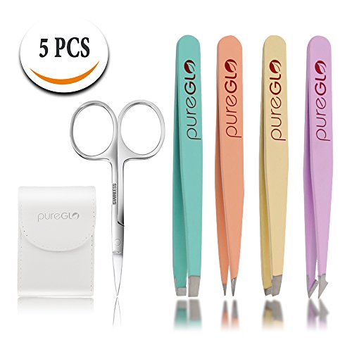 Tweezers Set 5-piece - pureGLO Professional Stainless Steel Slant and Pointed Tip Tweezer Set with Scissors - Best Precision for Eyebrow, Ingrown Hair, Splinter