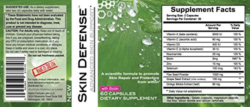 -. Title : Dark Spots, Sun Damage, Acne Scar, Complexion. Hair Skin and Nail Supplement Multi Vitamins For Women + Men ★SKIN DEFENSE★ ADVANCED SKIN SUPPORT 60 capsules - Biotin 5000mcg, GRAPE SEED EXTRACT, Ginkgo Biloba, ZINC, Flax, Niacinamide. Vit A, C, D + E. Promotes Beautiful Radiant Skin from Within.