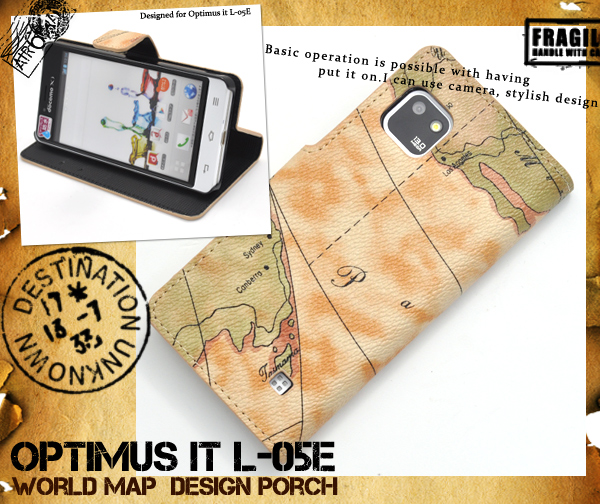 レトロな世界地図デザインがオシャレな、Optimus it L-05E用ケースポーチ!