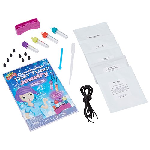 -. Feature : Wear science experiments around your neck / A real chemistry set, just charmingly small / Conduct 4 awesome experiments / Includes 4 tiny test tubes with caps and stand, measuring scoop, chemicals, satin cords and instructions / Recommended for children 8 years of age and older