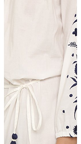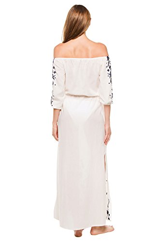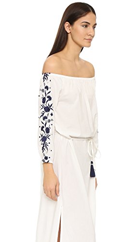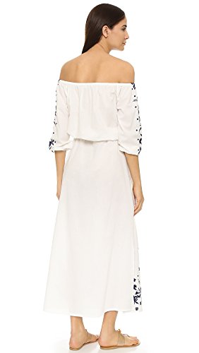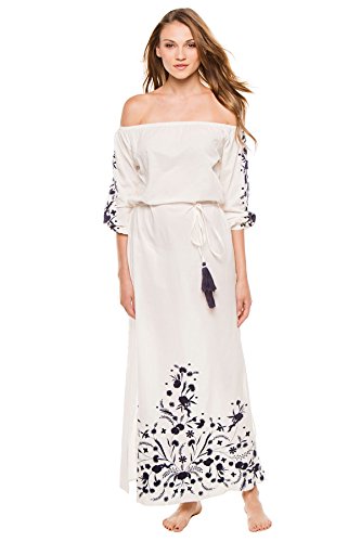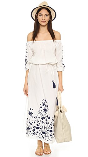 Product DescriptionA folk-inspired PAMPELONE maxi dress with contrast embroidery at the 3/4 sleeves and split hem. Tassels detail the drawstring waist. Covered elastic off-shoulder neckline and cuffs. Unlined.0
