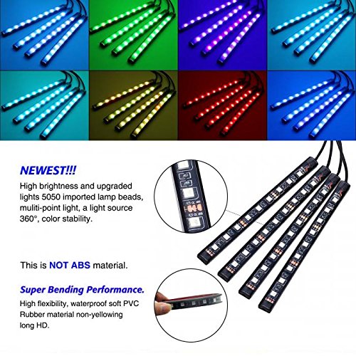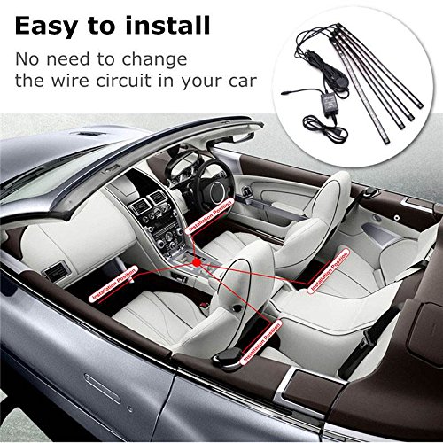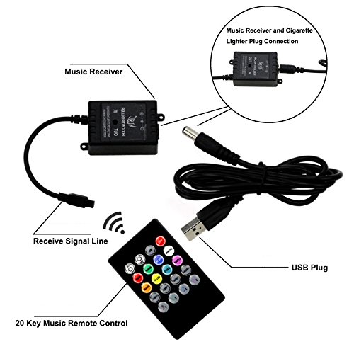 - ✔ 【Sound-activated and Remote control】---4 kinds of music effects control mode, 8 kinds of color control, brightness control, ON / OFF, 2-hop mode control, fade out 2 mode control. Remote control not only can easy switch the led mode and adjust the brightness as you wish, but also sound-activated allows you enjoy the fun with the color changing following your car stereo music rhythm.
