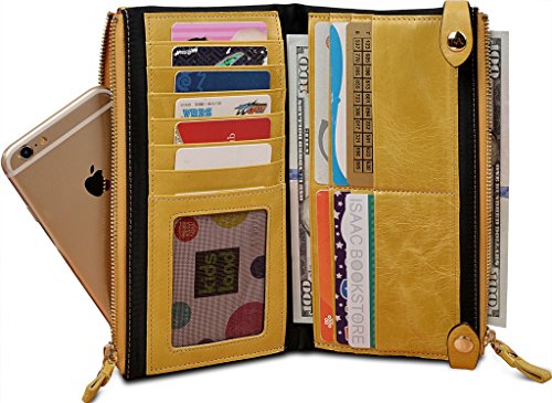 - Feature : Genuine Leather interior with nylon fabric exterior,soft feeling and durable use. / Detailed streamlined stitching with gold-tone smooth zippers has greatly highlights its elegance.High quality hardware has high resistance to rust,corrosion and tarnishing.Shiny as a new one even years later. / Doulbe zippered compartments for cash/change/phone,with 13 card slots including a clear photo slot.Can hold a iphone 6,lip gloss, cards and cash. / This purse comes in a cute gift box and it is already ready to be a great gift for your family and friends.Perfect for a night out /travel/dating. / Dimensions: 7.3"(L) x 3.7"(W) x 1.1"(H),weight is 0.33 pounds