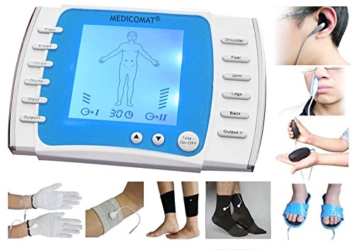 -. Feature : Medicomat® Medical Automat Series * THE WORLD'S BEST HEALTHCARE APPARATUS / Acupuncture Massage Pain Treatments * Medicomat ear acupuncture provides a fully automatic treatment for the whole body, complemented by the effects of Wrist and Nasal Semiconductor low-level (output 1-5mW, wavelength 650nm) Laser Irradiation Therapy and body acupuncture massage therapy through the palm and foot electrodes and conductive silver fiber garments socks, gloves, wristlet and ankle. / 10 Treatment Modes: Press Knead Vibrate Thump Waist Shoulder Feet Joint Legs Back. Easy to Operate * Electricity & Batteries * Screen & Time Set * Voice Guide * 2 x Output for Therapy * Double Effect - You can use them simultaneously and choose two therapies at same time for the better therapeutic effect. / The conductive garments are made with high quality silver fiber threads which conduct the electrical impulses throughout the whole garment, providing acupuncture and electrotherapy over the complete area covered by the garment. Producing an even distribution giving maximum comfort and efficiency, and complete ease of use. / Free Shipping Worldwide - Delivery of this item is carried out from Hong Kong by express courier services. Read more at Medicomat.com and view product video at Medicomat.com/yt21.php